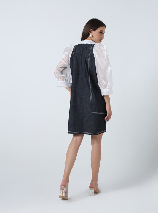 EMBROIDERED POCKET DETAIL DENIM DRESS